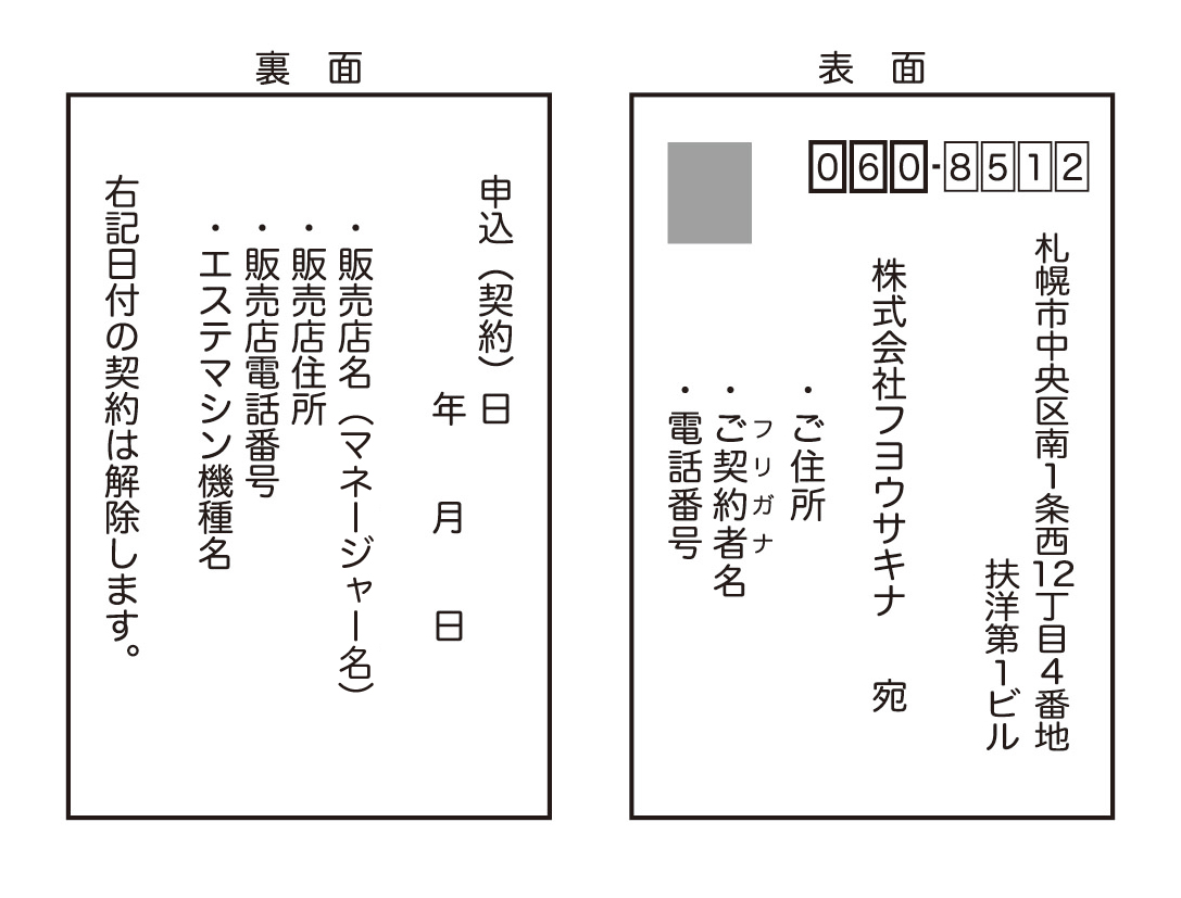 ◯書面でのお申し出の場合は、ハガキ等に必要事項(販売店名・氏名・ご住所・電話番号・ご契約日・エステマシン機種名)をご記入の上、以下の送り先へご郵送をお願い致します。