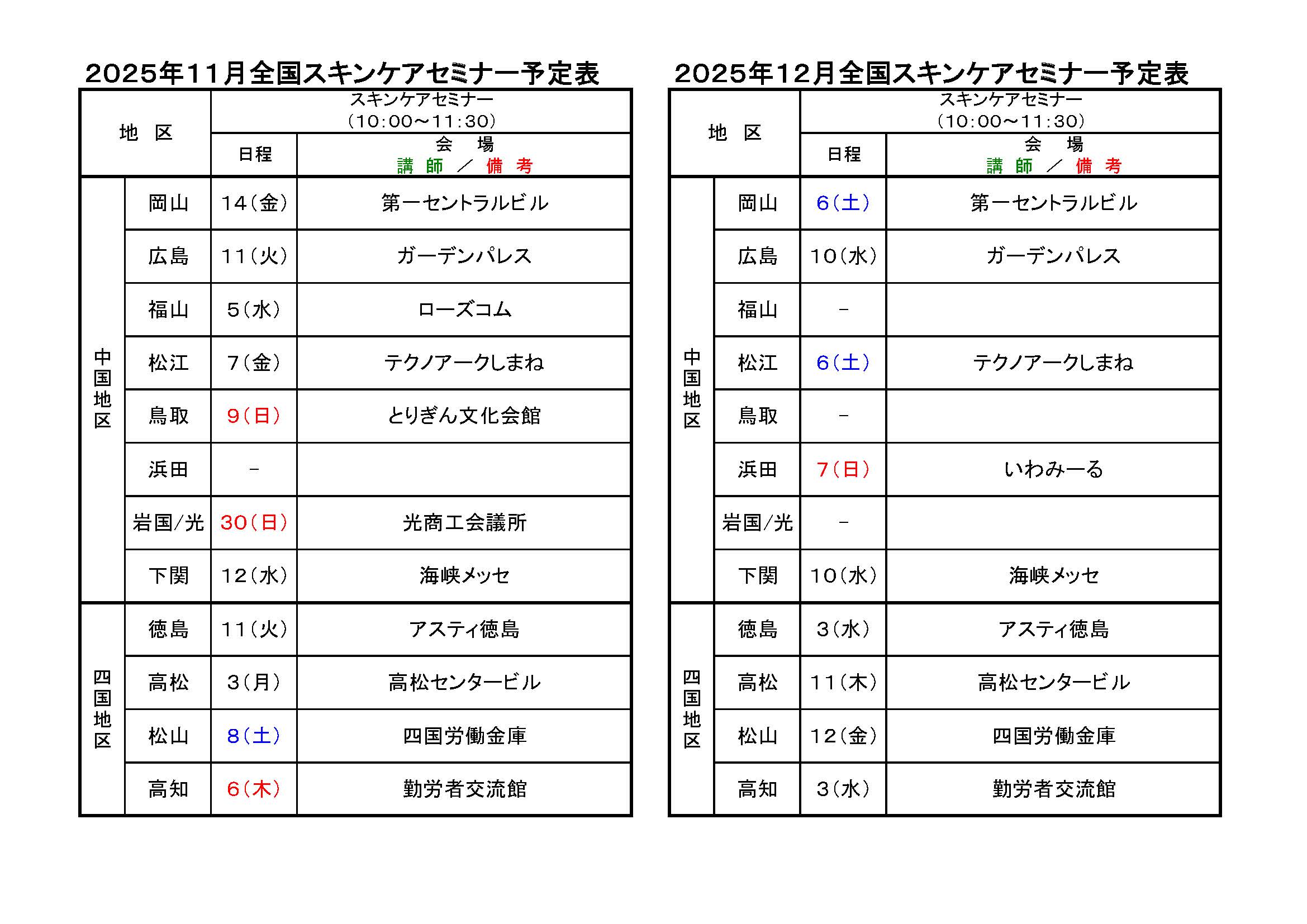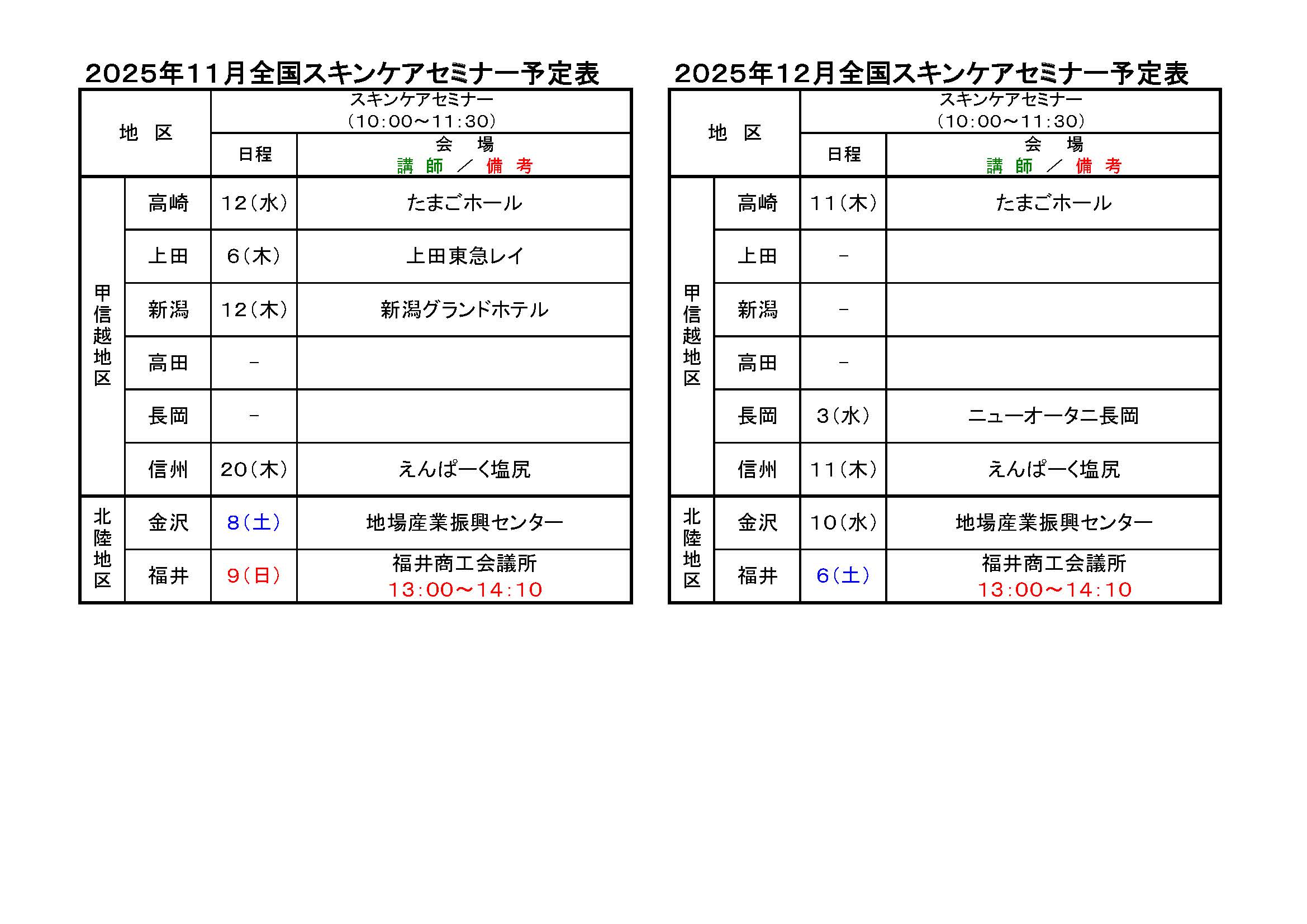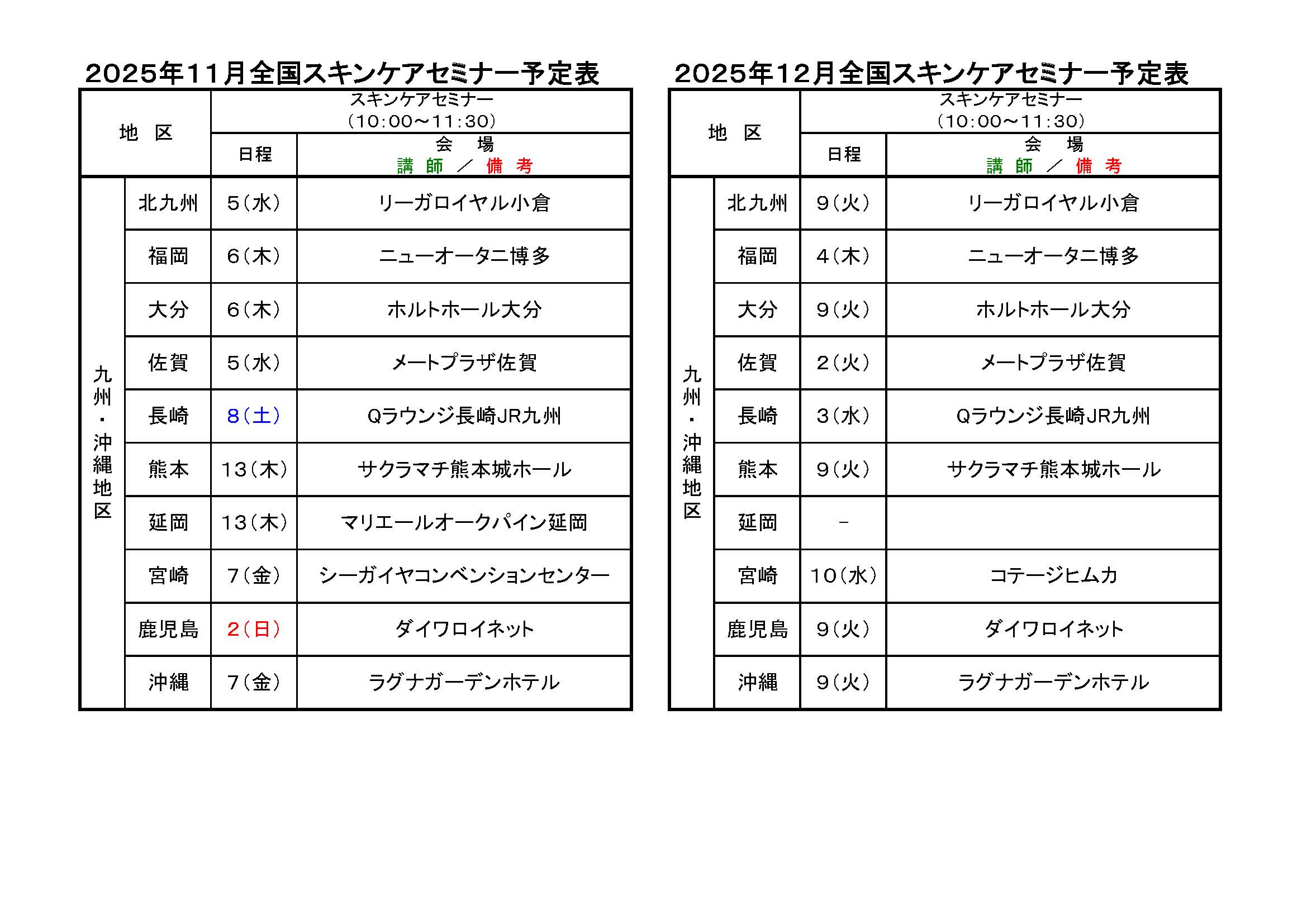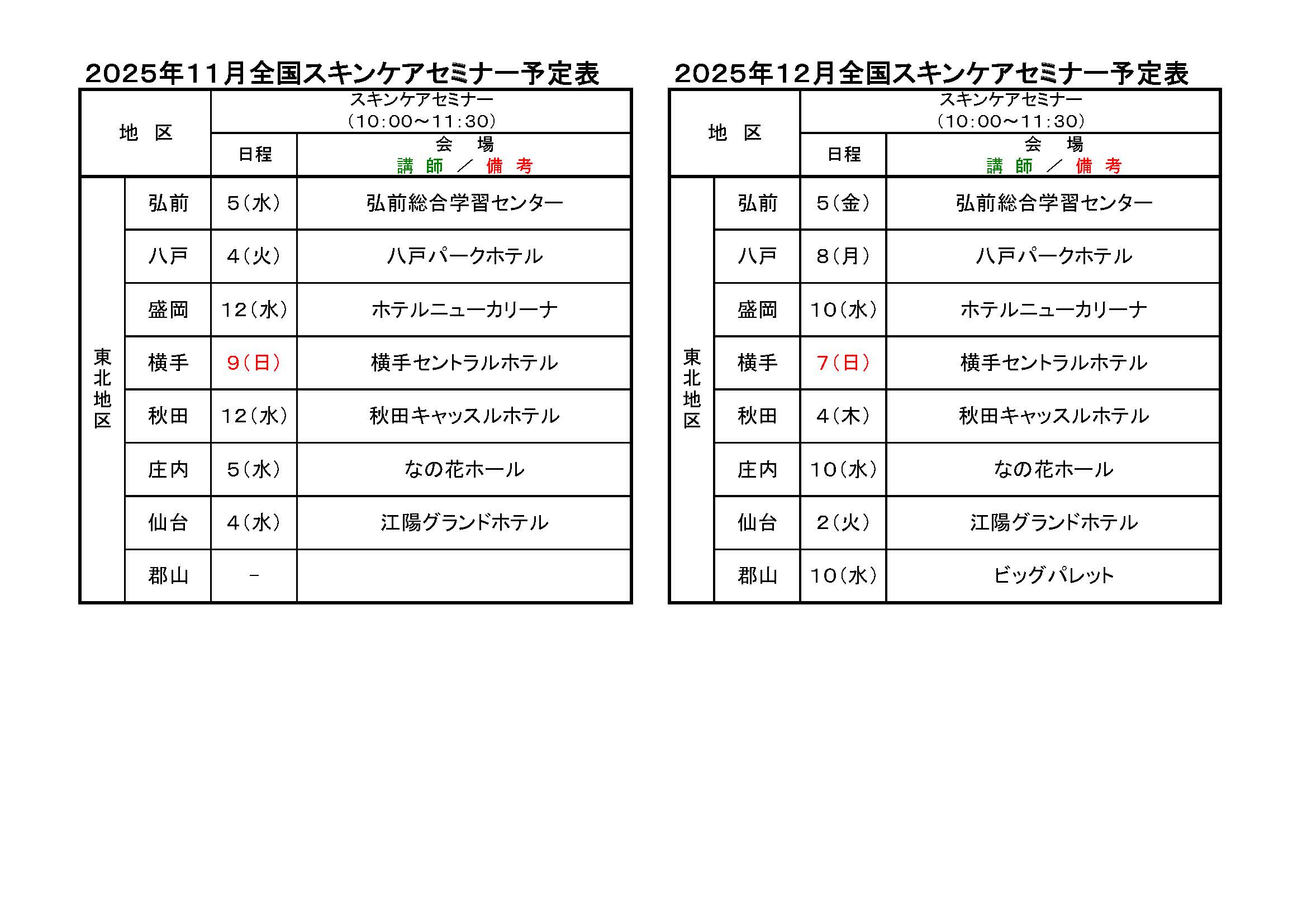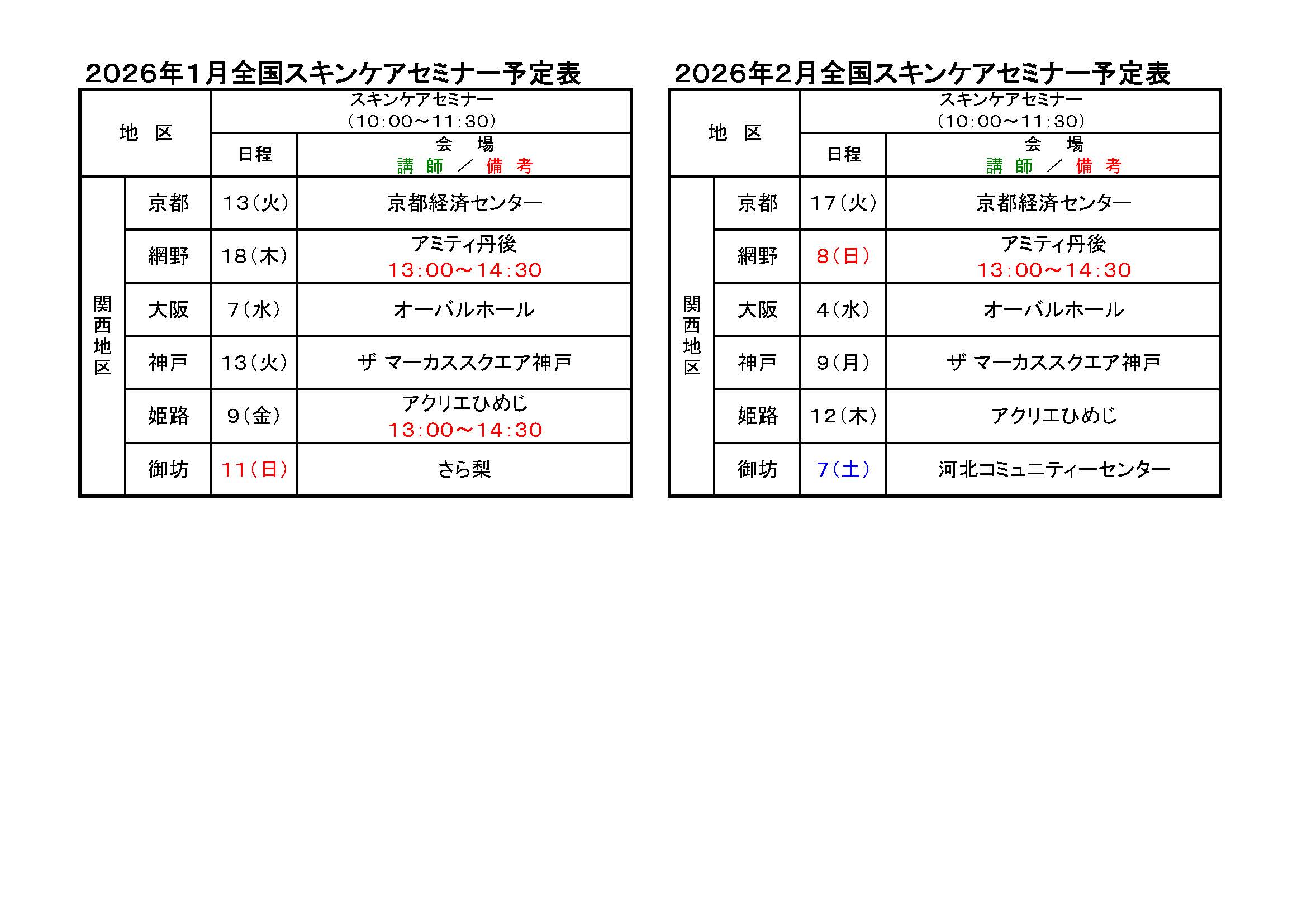 日程及び会場は変更になる場合がございます。最寄りのサキナビューティーラウンジ/スペースにてご確認頂きますようお願いいたします。