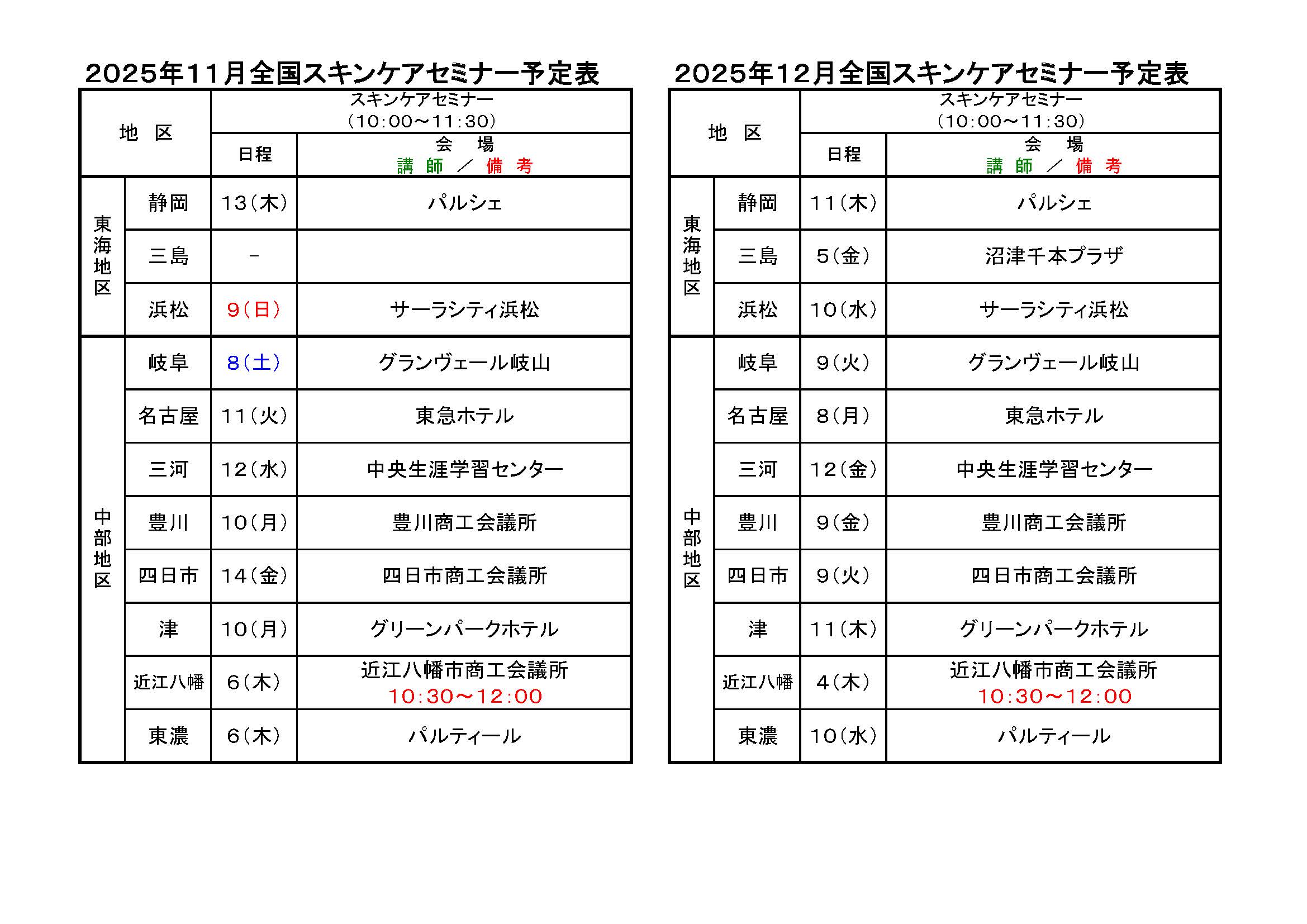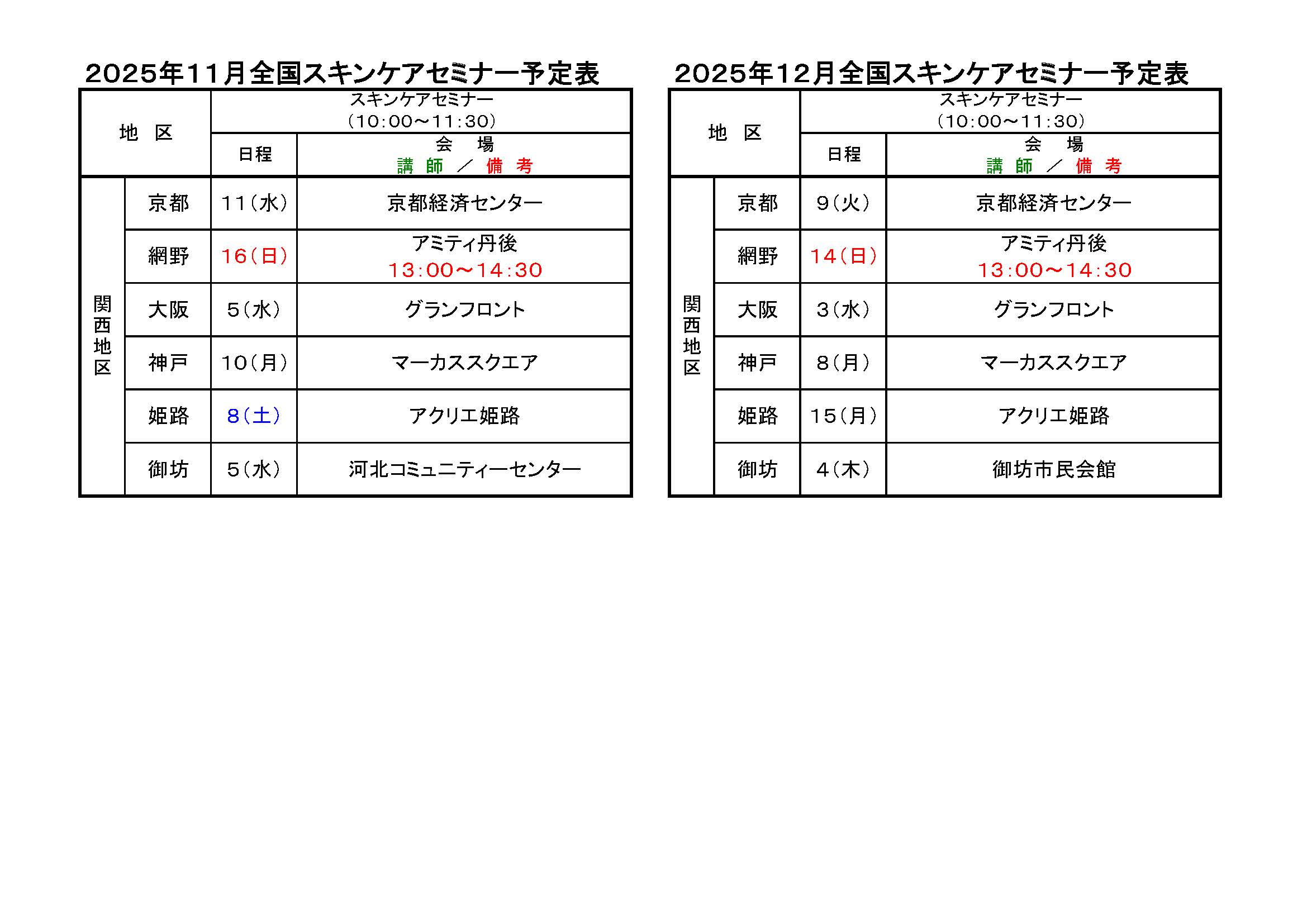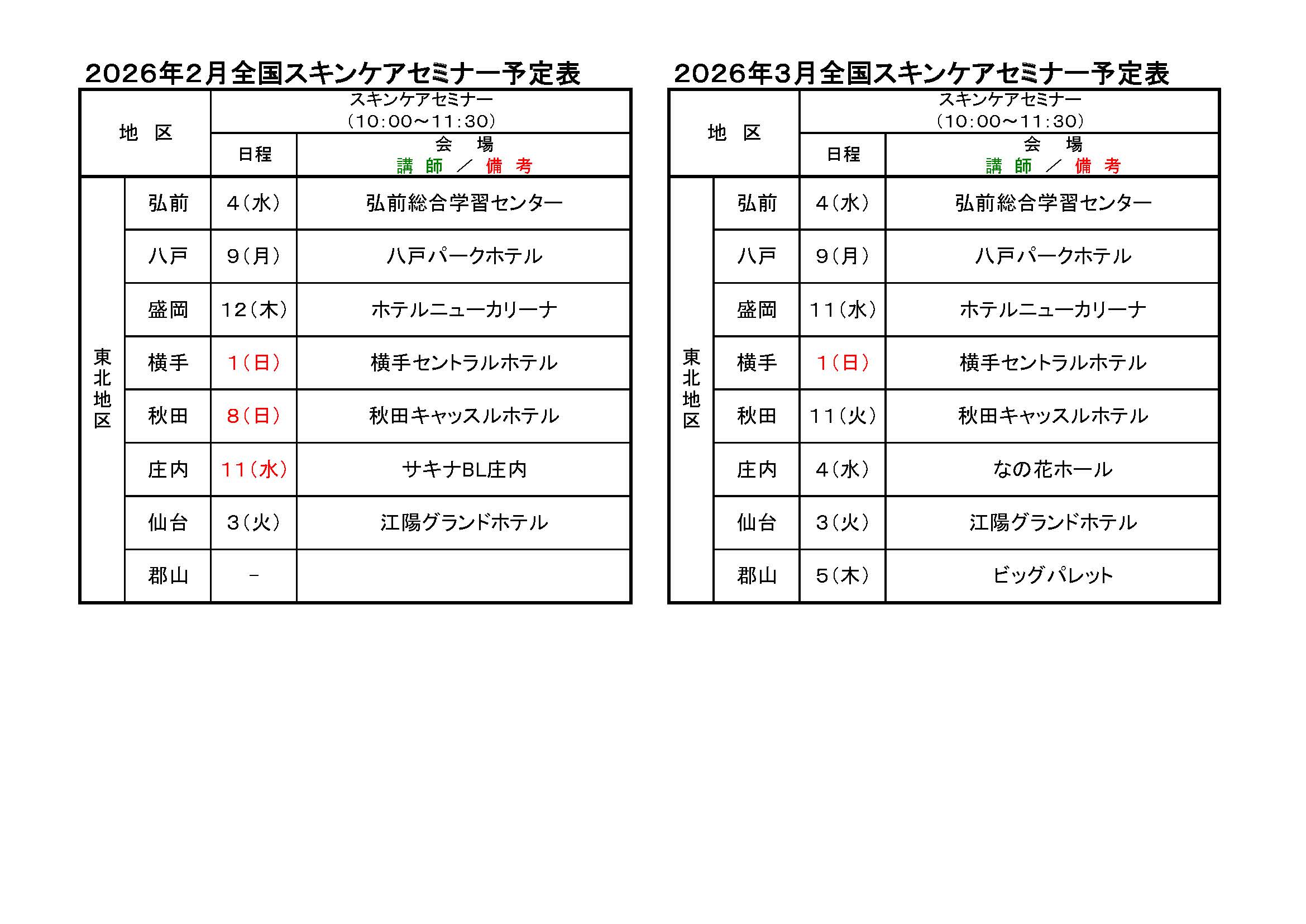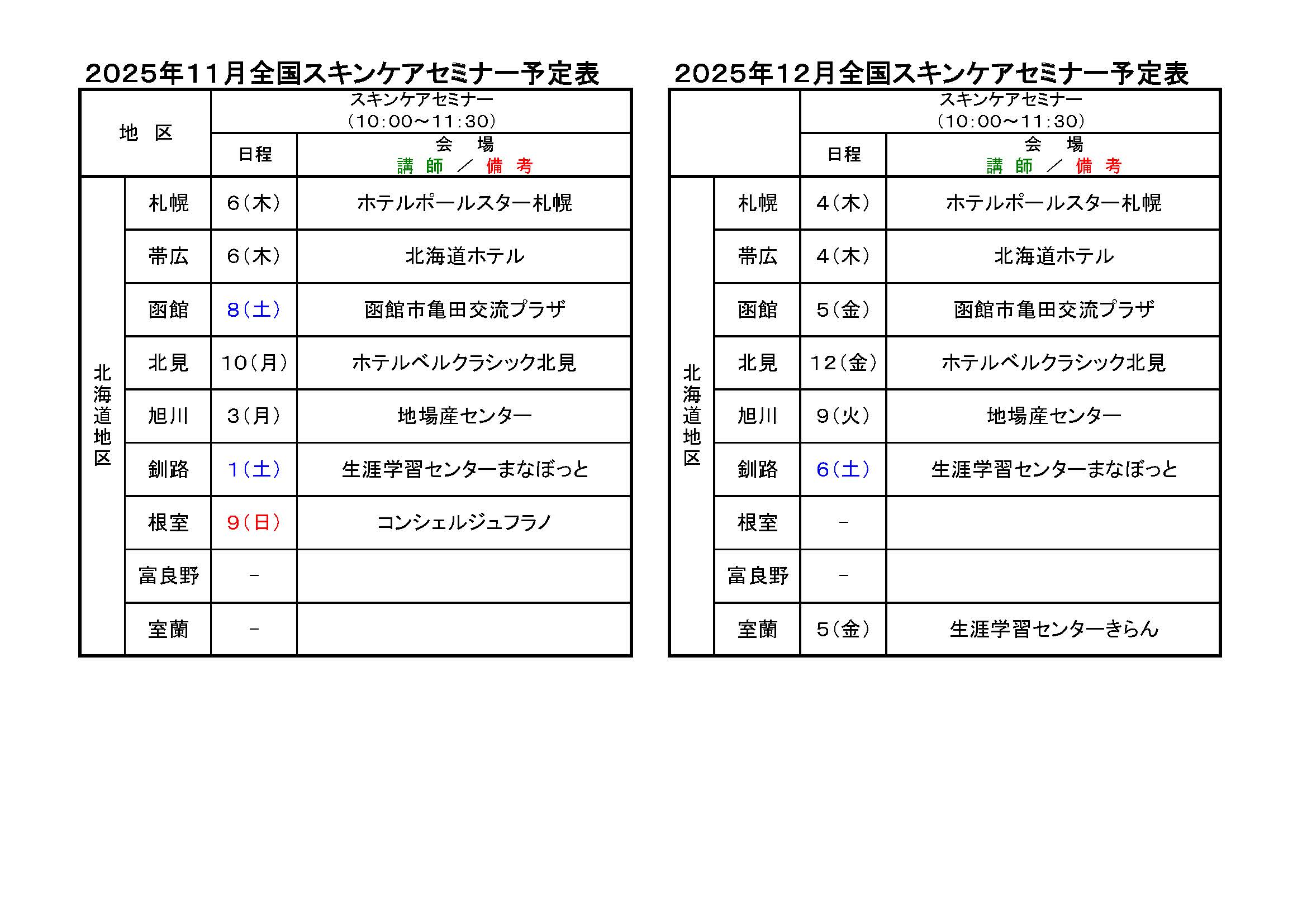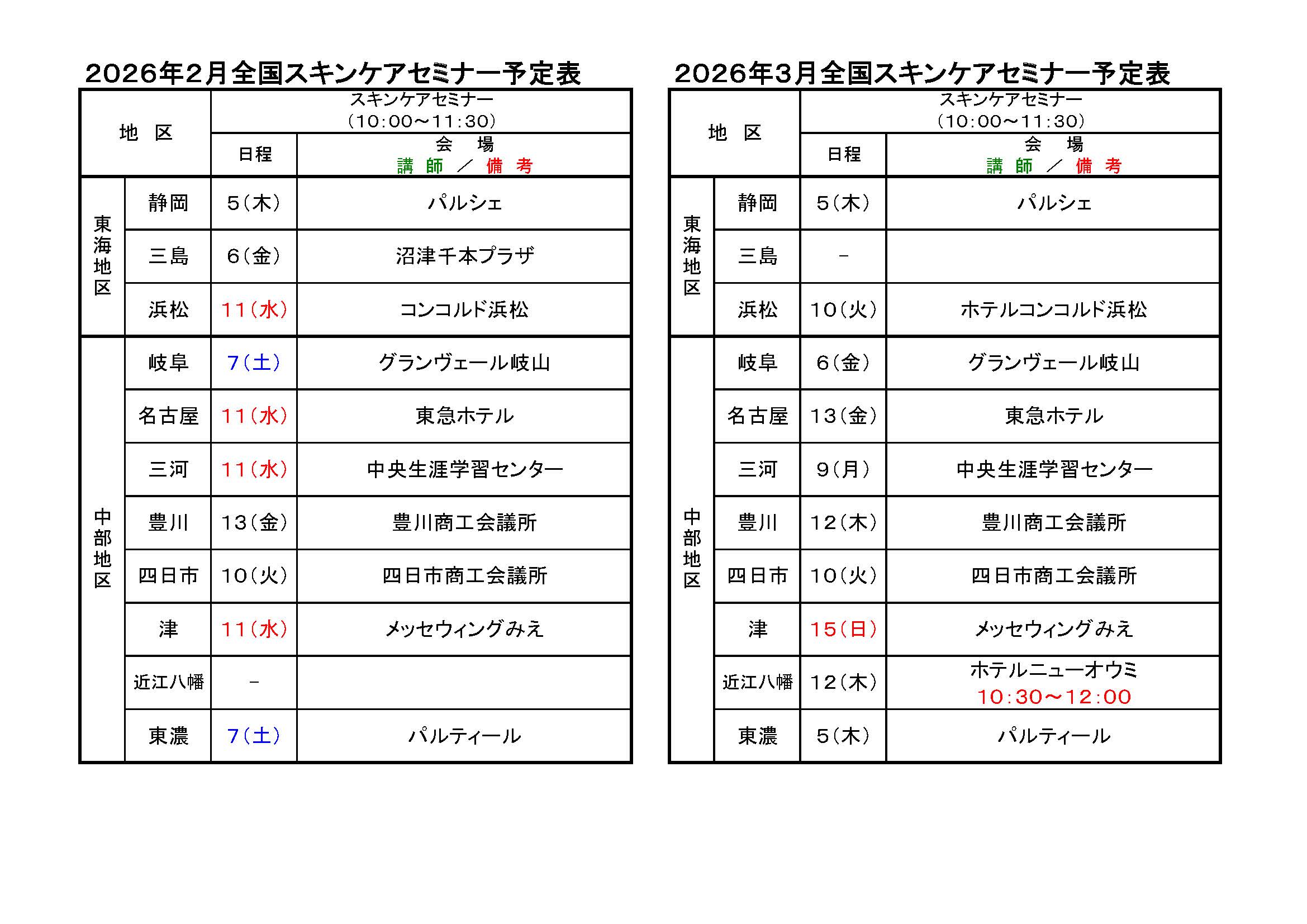 日程及び会場は変更になる場合がございます。最寄りのサキナビューティーラウンジ/スペースにてご確認頂きますようお願いいたします。