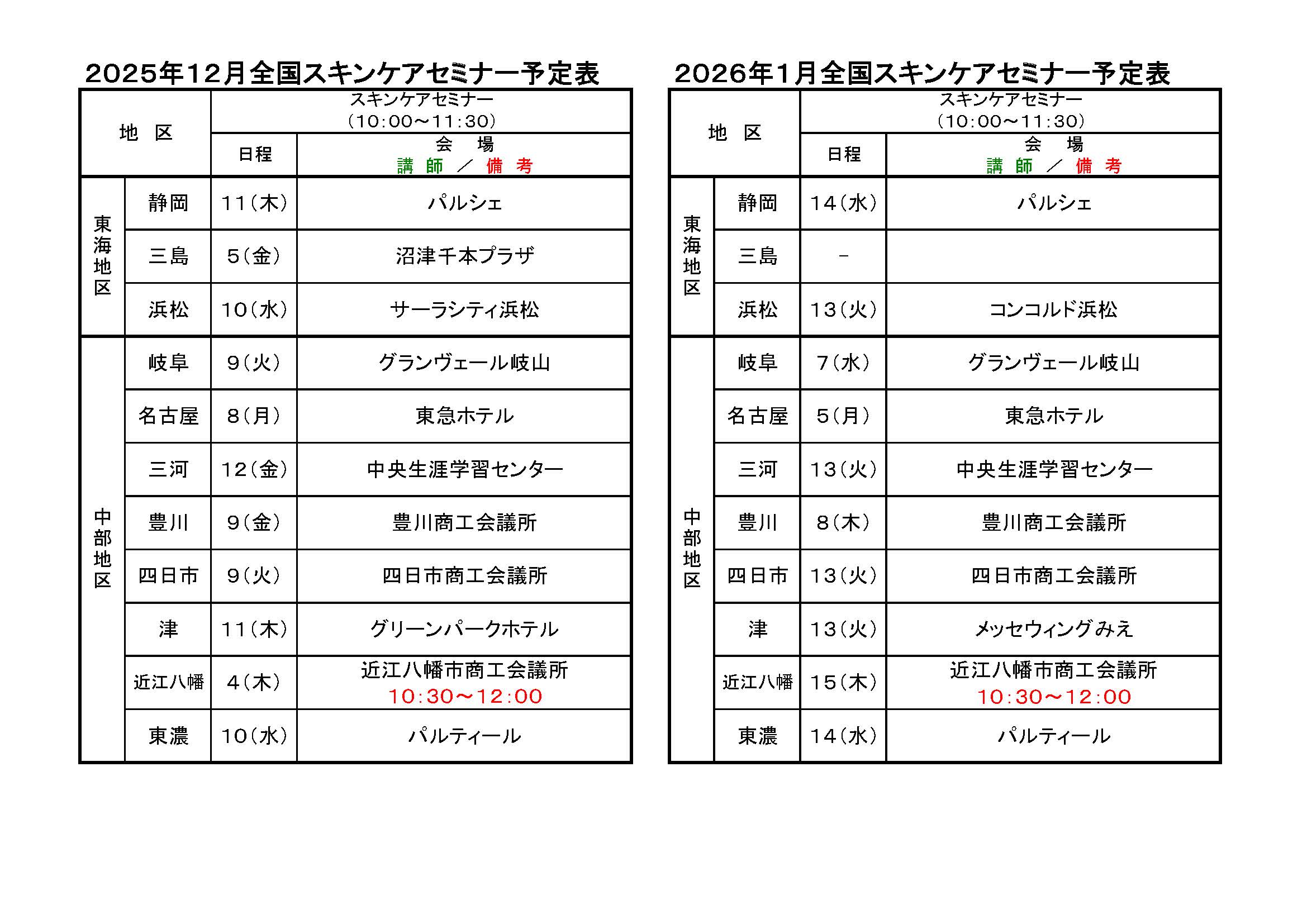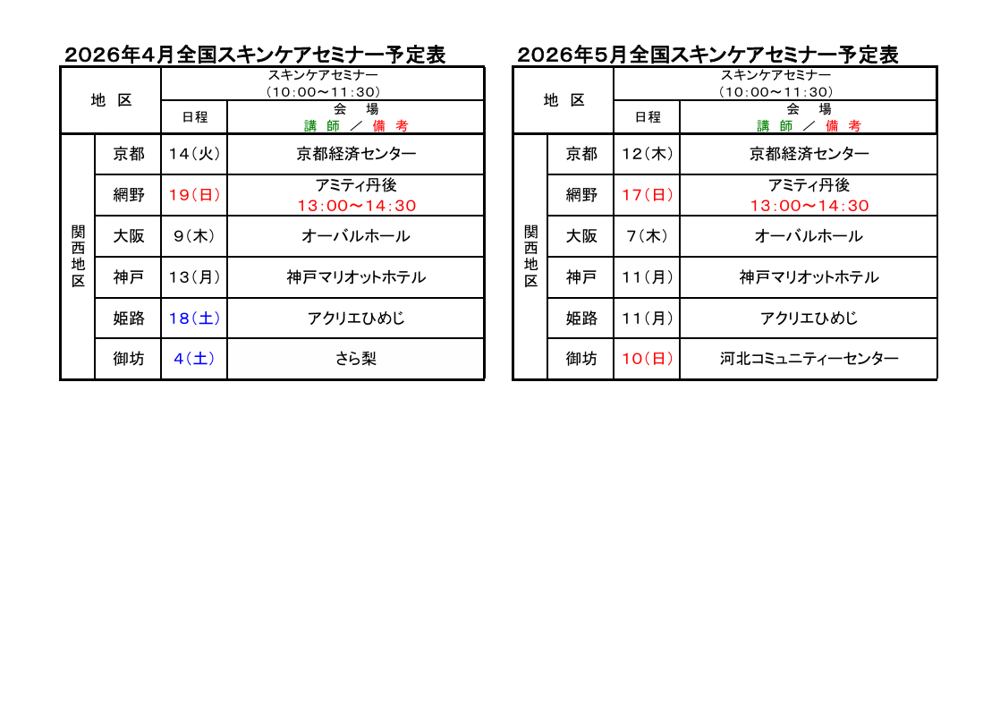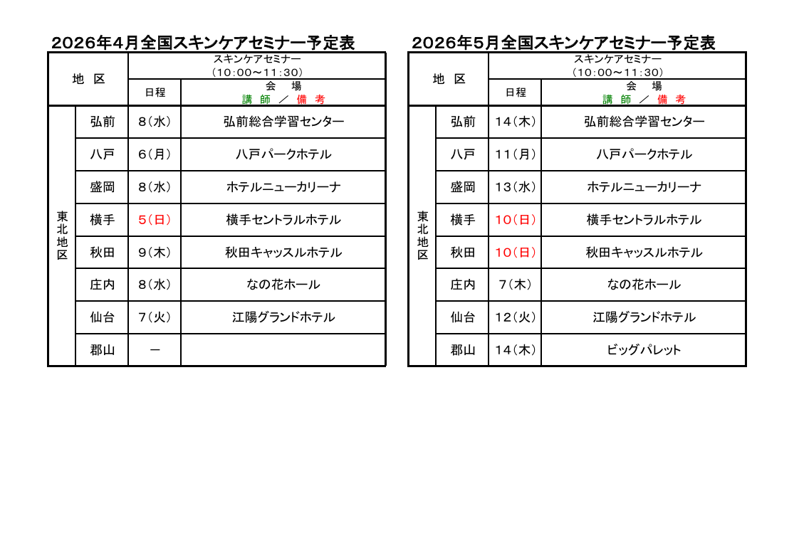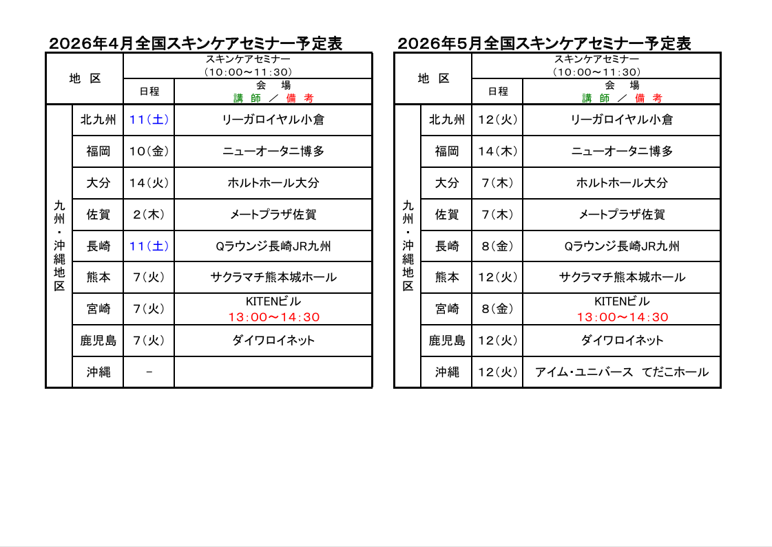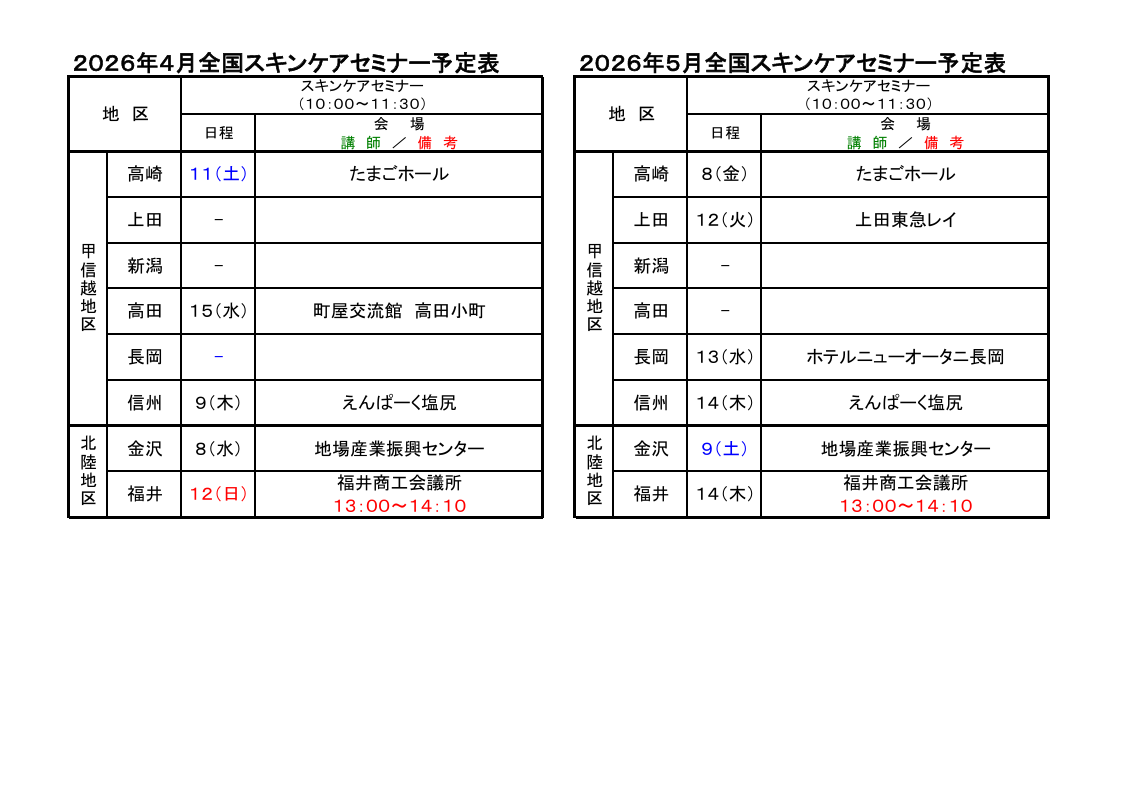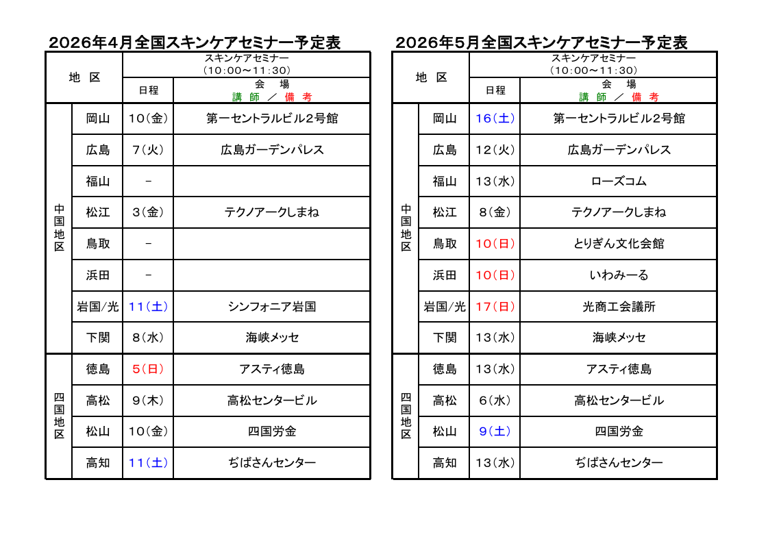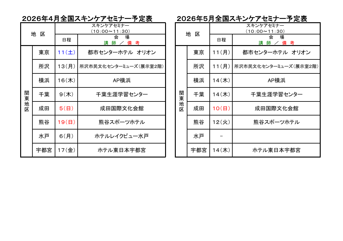 日程及び会場は変更になる場合がございます。最寄りのサキナビューティーラウンジ/スペースにてご確認頂きますようお願いいたします。